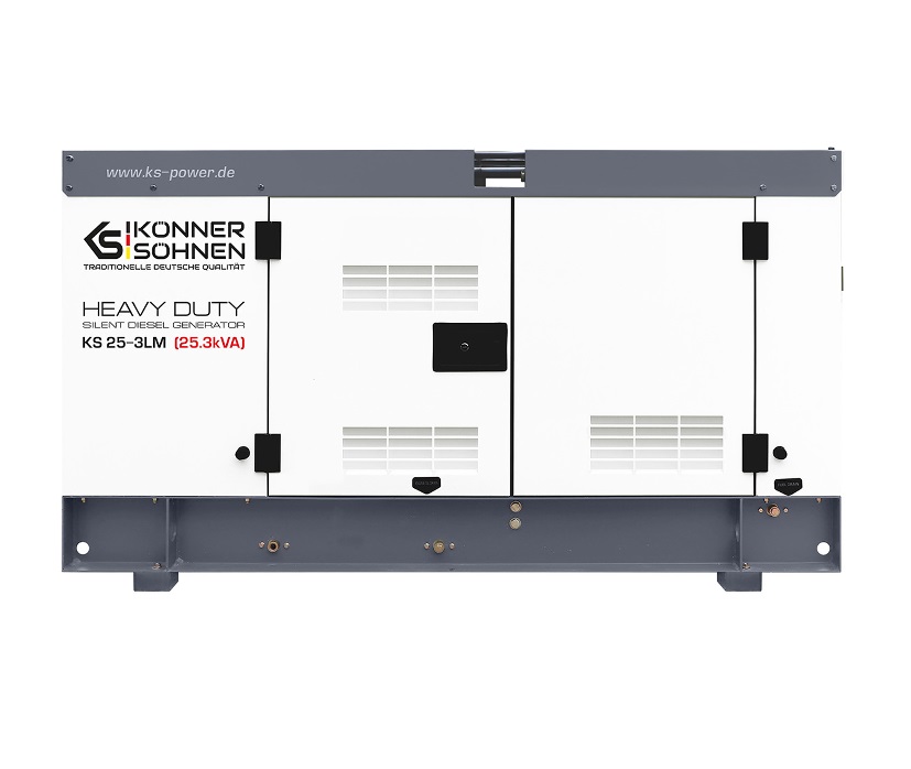 Високоякісний шумозахисний корпус забезпечує суттєве зниження шуму під час роботи установки, має покращений терморозподіл, захищає електростанцію від вологи та конденсату, від несприятливих погодних умов та несанкціонованого втручання. Відносно невеликі розміри електростанції дають більше можливостей для розміщення електростанції. Порошкове антикорозійне покриття сприяє більш тривалому термін експлуатації агрегату. Крім того низько обертові двигуни зі зменшеним рівнем вібрації, закріплені на антивібраційних подушках, що також сприяють більш тихій роботі та зменшенню навантаження на фундамент. Електростанція має кнопку аварійної зупинки STOP для швидкого вимкнення двигуна у разі надзвичайної ситуації. Корпус має отвори для кріплень транспортувальних засобів, що полегшує відвантаження, перевезення та встановлення агрегату. Широкі розпашні дверцята з обох сторін корпусу забезпечують безперешкодний доступ до деталей агрегату для вільного доступу до основних вузлів дизельного генератора та зручного технічного обслуговування. Дизельні електростанції Könner & Söhnen проходять передпускову підготовку та тестовий запуск з контролем дотримання всіх параметрів правильної роботи в Європі у власному сервісному центрі. На спеціальному навантажувальному стенді перевіряється потужність, що видається станцією в різних режимах роботи, налаштовується блок керування електронікою.