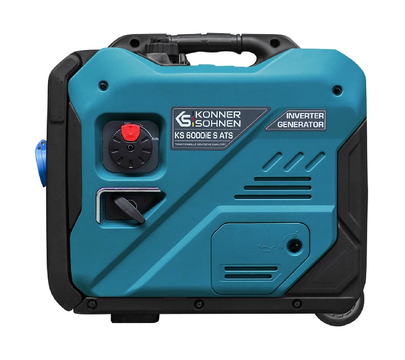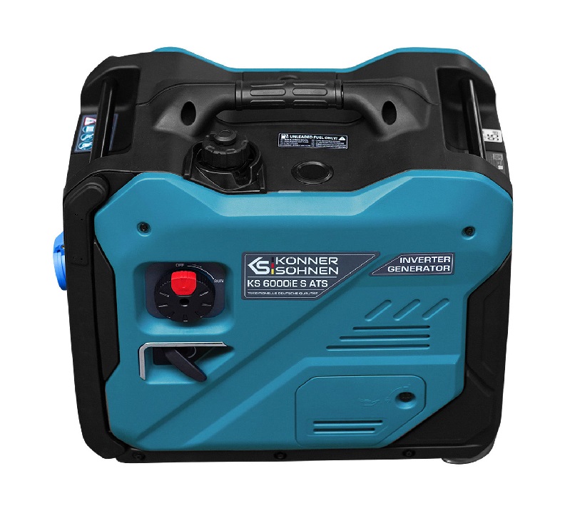 Інверторний генератор KS 6000iES ATS має вбудований блок АВР і може працювати як в ручному, так і в автоматичному режимі. Поворотний перемикач OFF-RUN на правій стороні генератора поєднує в собі бензиновий кран, вимикач внутрішнього живлення 12 В і вимикач запалювання. Коли генератор не використовується, він повинен залишатися у положенні OFF, щоб літієва батарея генератора не розрядилася. Генератор поставляється з відключеною батареєю, яку необхідно підключити під лівою кришкою перед першим використанням. Акумулятор заряджається від внутрішнього зарядного модуля, під час роботи генератора, або коли на MAINSINPUT є напруга 230 В (незалежно від положення поворотного перемикача). Напруга на MAINS INPUT 230V контролюється, як тільки поворотний перемикач встановлений у положення RUN та ATS SWITCH у положення ON. Якщо напруга 230 В на MAINS INPUT зникає, контролер АВР запускає генератор і перемикає розетки 230 В на живлення від інверторного модуля генератора.