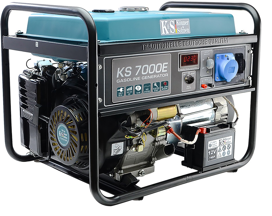Для торгової марки «Könner & Söhnen» спеціально були створені двигуни серії KS, що пройшли багатогодинні та багаторівневі тести. Фірмові двигуни KS надійні, зносостійкі та економічні. Надійний двигун Könner & Söhnen відповідає всім європейським стандартам якості, в тому числі сучасному екологічному стандарту EURO V. Двигуни відповідають усім світовим та європейським стандартам якості, економічності, екологічності (зокрема рівень шкідливих викидів та рівень шуму). Кожний двигун та кожний генератор мають свої індивідуальні серійні номери, що дозволяє нам контролювати якість виробництва та сервісного обслуговування. Двигуни Könner & Söhnen вирізняються легким стартом та пониженою вібрацією. Лінійка бензинових генераторів KS 7000 оснащена надійним 1-циліндровим двигуном потужністю 13 к.с. Система полегшеного старту дозволяє швидко завести двигун, не докладаючи значних зусиль. Більш потужні моделі додатково обладнані системою електричного старту для зручності викоричтання.