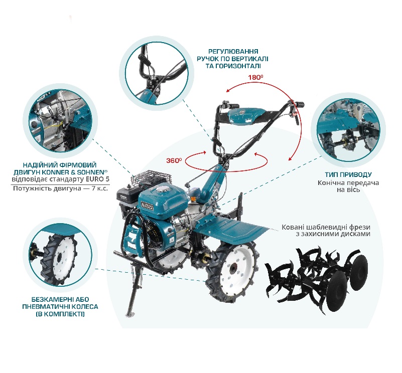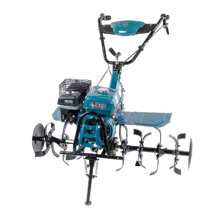Ергономічна панель управління дозволяє швидко управляти і легко маневрувати культиватором. Можливість вертикального регулювання ручок на 180° та горизонтального на 360° дозволяє налаштувати культиватор під будь-якого користувача, забезпечує легке керування та зручне зберігання культиватора. Панель оснащена кейсом для інструментів. Модель культиватора KS 7HP-1050G має безкамерні колеса з низькопрофільною резиною, що не потребують підкачування в процесі роботи. Ковані шаблевидні фрези підходять для використання культиватора з будь-яким типом ґрунту, як з цілинним, так і з більш доглянутим. Для захисту рослин при оранці передбачені захисні бокові диски. Фрези збираються групою з 4-х ножів. Металеві диски входять до комплекту. Для моделей потужних культиваторів «Könner & Söhnen» з прямим приводом та КПП передбачена можливість встановлення навісного обладнання. Широкий вибір навісного обладнання призначеного для обробки всіх типів грунтів для максимального задоволення потреб споживачів. Для більшої зручності в роботі, культиватор оснащений кейсом для інструментів. Тепер найнеобхідніше завжди буде у Вас під рукою.