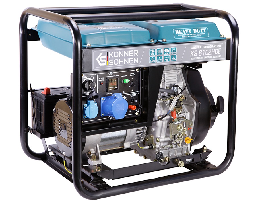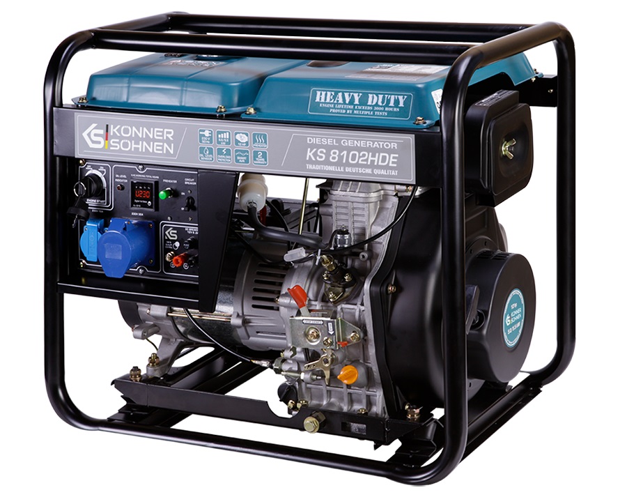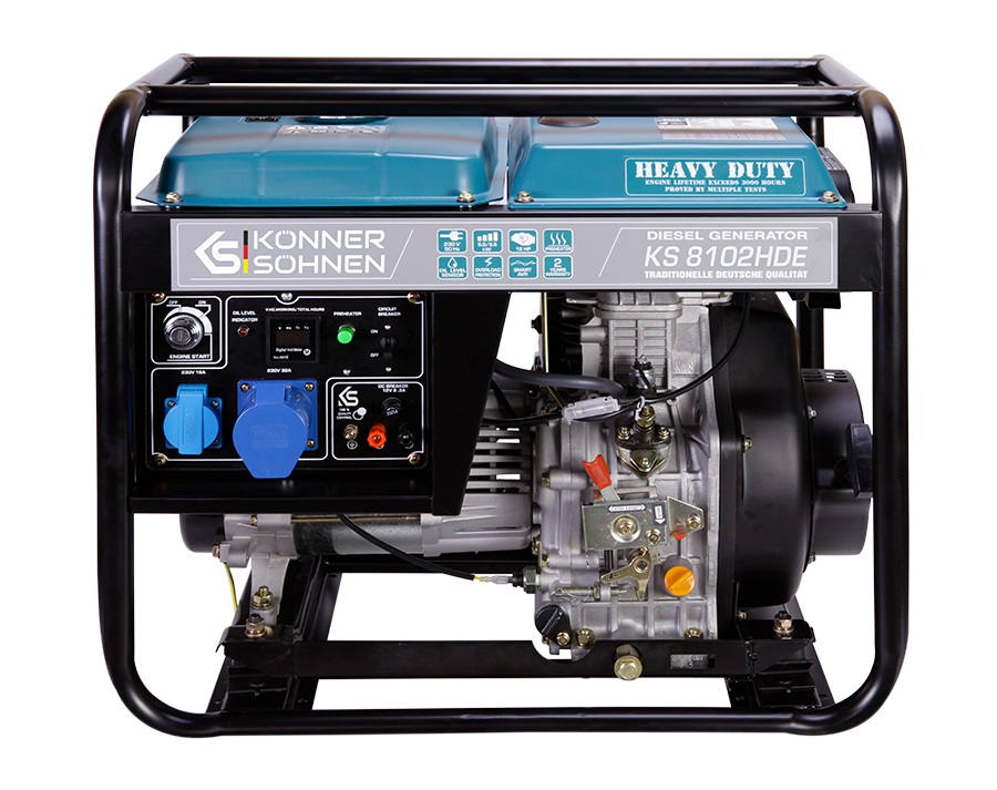 Дизельні генератори серії «HEAVY DUTY» оснащені функцією передстартового підігріву, яка дозволяє запускати генератор в зимовий час без зайвих зусиль. Генератори «Könner & Söhnen» серії «HEAVY DUTY» оснащені інтелектуальною системою стабілізації напруги AVR. Вона дозволяє утримувати вихідну напругу генератора на постійній величині 230В і захищає від небажаного короткого замикання та перенавантаження. Завдяки додатковому підсиленню рами верхніми захисними планками, генератор професійної серії HEAVY DUTY може експлуатуватись у більш жорсткому режимі, посилена рамна конструкція додатково захищає від пошкоджень баку при експлуатації та транспортуванні. Для всіх моделей дизельних генераторів «Könner & Söhnen» в комплект входять додаткові гумові опори для захисту рами від корозії. Завдяки опорам, працюючий генератор не пошкодить покриття підлоги, а фарбування рами не буде подряпане. Також в комплект можна придбати транспортувальний набір. Генератор укомплектований додатковими аксесуарами: вилка переносна 2Р+РЕ 16А 230В, силова вилка переносна 2P+Е 230В, 32А, ключ ріжковий, 8×10 мм, ключ ріжковий, 12×14 мм, ключ ріжковий, 17×19 мм, викрутка двостороння 6.0 мм, РН2.