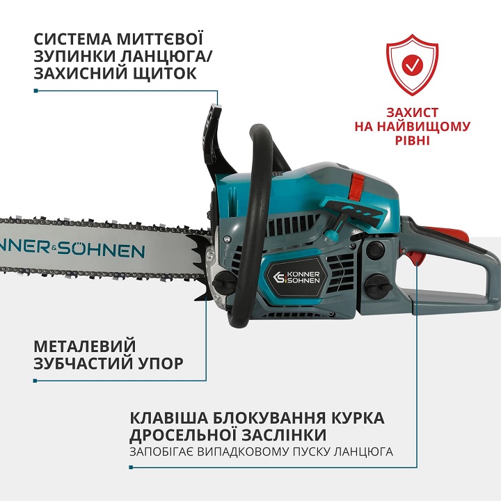 Бензинові ланцюгові пили Könner & Söhnen® оснащені вбудованими захисними функціями.