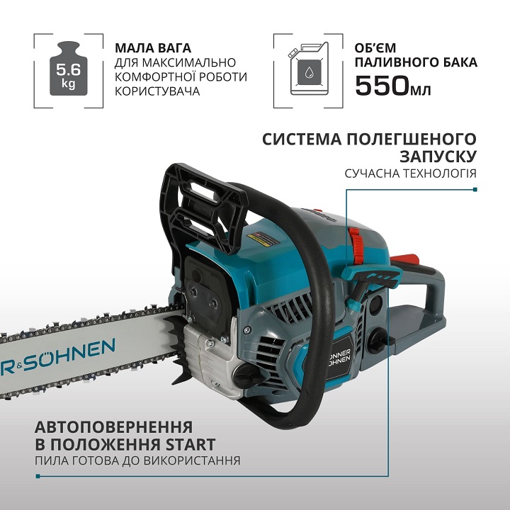 Ергономічний дизайн та невелика вага забезпечують комфортну роботу навіть при тривалому використанні. Зробіть свою роботу приємнішою з бензопилою Könner & Söhnen!