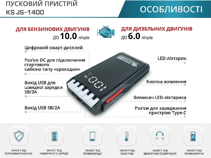 Пусковий пристрій KS JS-1400 буде незамінний у випадках, коли акумулятор авто розрядився, або коли його заряду не вистачає для запуска двигуна, що особливо актуально в холодні пори року. Він оснащений сучасною якісною літій-іонною батареєю 18000 мА·г з високим струмом віддачі до 1400 А, що дозволяє запускати автомобілі з бензиновими двигунами до 6 літрів та дизельними двигунами до 3 літрів за лічені секунди. Клеми мають додаткове з’єднання фіксуючих пластин кабелем, що дозволяє збільшити площу фіксації та зменшити опір під час передачі потужності.
