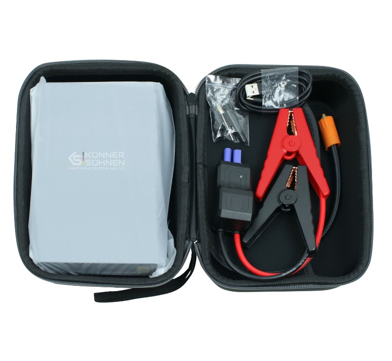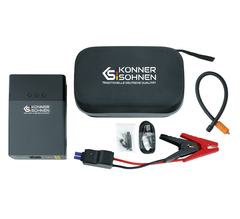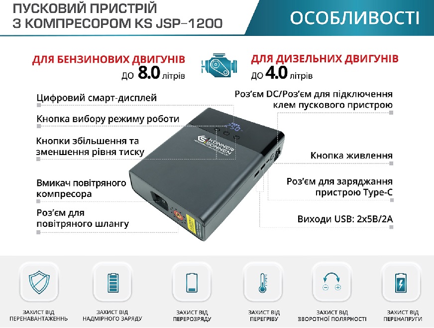 Пусковий пристрій з компресором KS JSP-1200 буде незамінний у випадках, коли акумулятор авто розрядився, або коли його заряду не вистачає для запуска двигуна, або для підкачування шин транспортного засобу, спортивного інвентарю. Він оснащений сучасною якісною літій-іонною батареєю 14000 мА·г з високим струмом віддачі до 1200 А, що дозволяє запускати автомобілі з бензиновими двигунами до 8 літрів та дизельними двигунами до 4 літрів за лічені секунди. Клеми мають додаткове з’єднання фіксуючих пластин кабелем, що дозволяє збільшити площу фіксації та зменшити опір під час передачі потужності.