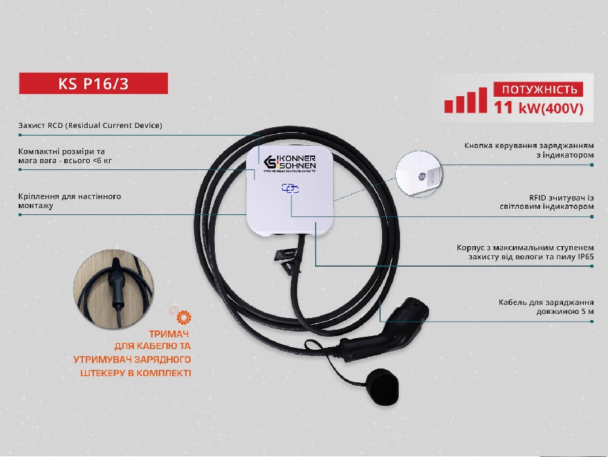 Оснащена зарядним штекером Type 2 (відповідно до DIN EN 62196-2), який підходить для більшості моделей електромобілів. Завдяки зарядному кабелю довжиною 5 м ви зможете використовувати різні варіанти для паркування. Станція оснащена зчитувачем карт RFID, який дозволяє розпочати зарядку саме власнику RFID картки. В комплекті міститься дві RFID-картки. За допомогою RFID-карток та використанню режиму «управління карткою» ви захищені від підключення неавторизованими користувачами