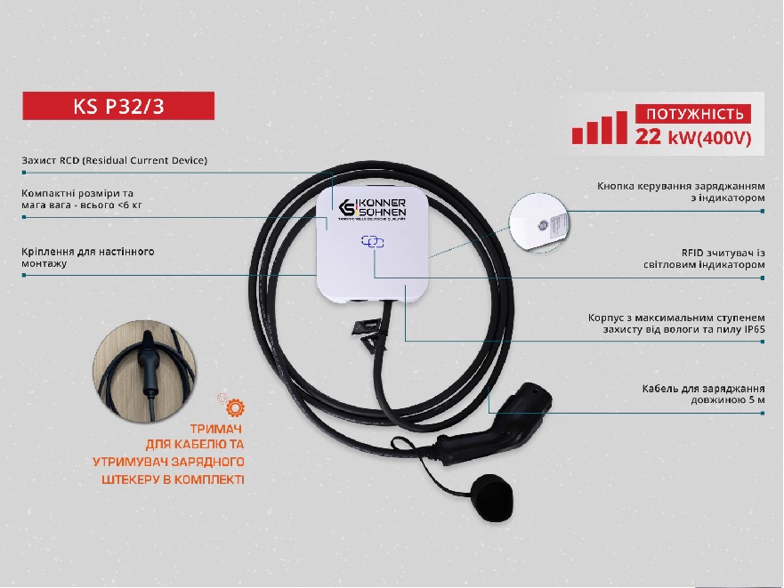 Міцний корпус з високоякісних матеріалів має кнопку управління. Світлові індикатори на передній панелі сповіщають про живлення, очікування (зелений індикатор), заряджання (синій індикатор) та про можливі помилки. Станції для зарядки електромобілів серії KS P від Könner & Söhnen® виготовлені в корпусі з класом захисту IP65, що забезпечує повний захист від проникнення пилу у середину, та захист від струменів води що падають під будь-яким кутом навіть під тиском. Цей пристрій може експлуатуватись на вулиці в будь-яких умовах. У комплекті до станції зарядки йде тримач для кабелю та утримувач зарядного штекеру, що дозволяє захистити зарядний штекер від пошкоджень в режимі очікування