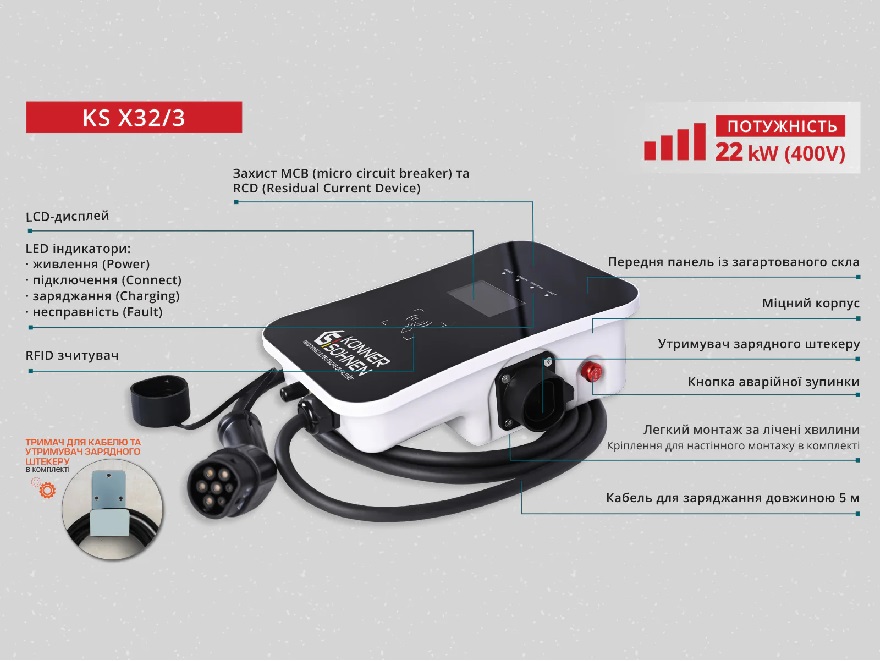 Станція для зарядки електромобілів KS X32/3 – це зручний та надійний спосіб зарядки електромобіля. Заряджання проходить швидше та безпечніше. Зарядна станція має вбудований захист від перенавантаження а також від витоку струму у разі порушення ізоляції та прямому дотику до однієї із струмовідних частин. Станція призначена для швидкого заряджання електромобілів, має багаторівневий захист від перегріву, нестабільної напруги, перевищення сили струму, перенавантаження, короткого замикання, несприятливих погодних умов та зовнішнього пилу. Оснащена MСB (micro circuit breaker) - автоматичним вимикачем, заземленням, контролем витоку струму через порушення ізоляції, контролем можливих несправностей, класом захисту IP54.