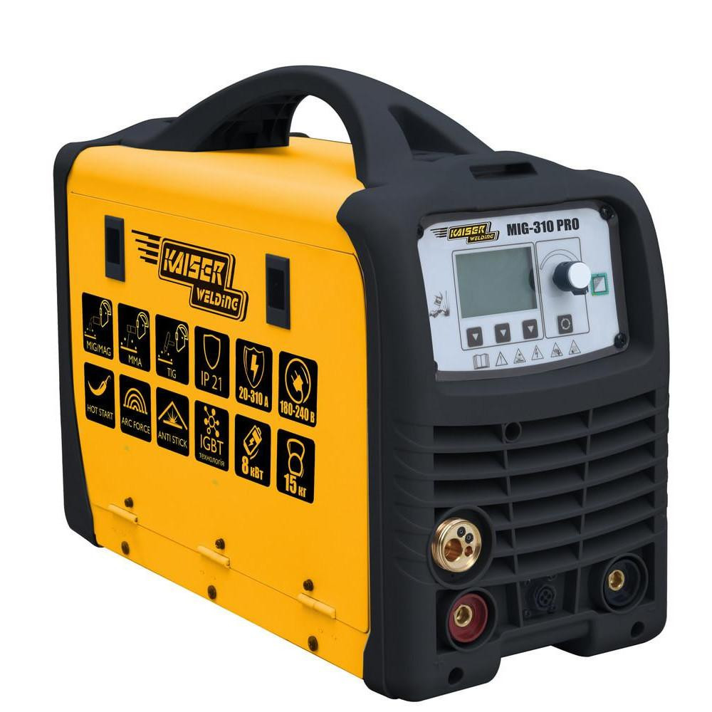 KAISER MIG 310 PRO – профессиональный мощный инверторный IGBT полуавтомат. Отличительные особенности – высокая мощность, функция 3 в 1 ( MIG|MAG , TIG , MMA) , цифровой дисплей для быстрой настройки работы режимов сварки/скорости подачи проволоки/выбора функций .
