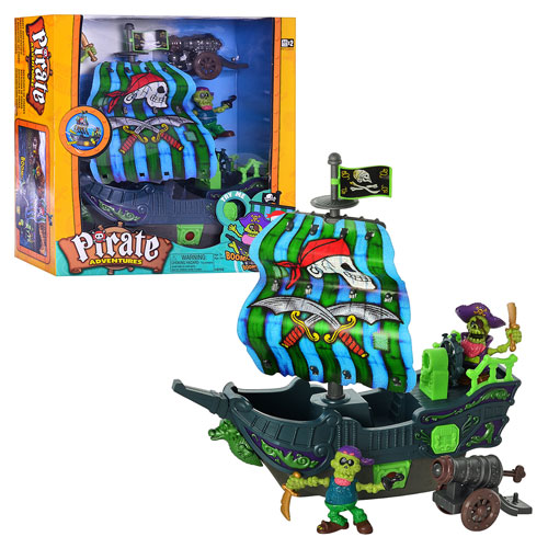 В наборе пиратский корабль с вращающимся вокруг мачты парусом и флагом, 2 фигурки вооруженных пиратов, сундук с сокровищами с открывающейся крышкой. Парус и флаг украшены устрашающим изображением черепа. Корабль оснащен пушкой со световым эффектом.