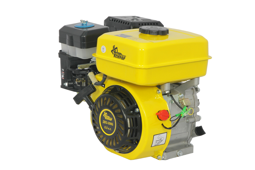 Двигатель внутреннего сгорания Кентавр ДВЗ-200Б – модульный универсальный бензиновый одноцилиндровый четырехтактный воздушного охлаждения двигатель общего назначения. Двигатель внутреннего сгорания Кентавр ДВЗ-200Б мощностью 6,5 л.с. и рабочим объемом 196 куб. см, может использоваться в составе миниэлектростанций, в сельскохозяйственной технике – мотоблоках, мотокультиваторах, косилках, самоходных шасси, ирригационных и оросительных системах, в строительном оборудовании – виброплитах, ударных трамбовках, бетономешалках, компрессорах, насосах и помпах. Что примечательно, крепление двигателя – универсальное. Фиксация шкива или зубчатого колеса на выходной части вала двигателя Кентавр ДВЗ-200Б для передачи крутящего момента на различные вспомогательные агрегаты, системы и узлы осуществляется при помощи шпоночного соединения. Для запуска ДВЗ используется ручной стартер. Чтобы избежать повреждения двигателя при отсутствии масла в картере или недостаточном его количестве, предусмотрена аварийная система. Таким образом, при низком уровне масла в картере система защиты остановит его работу, предотвращая поломку. Для облегчения доступа с разных сторон картера двигателя предусмотрены две горловины для заливки масла с пробками-щупами. Благодаря компактным габаритным размерам и небольшому весу двигатель Кентавр ДВС-200Б можно использовать в качестве силового агрегата транспортных средств, в том числе и водного транспорта – лодок, катеров и небольших яхт.