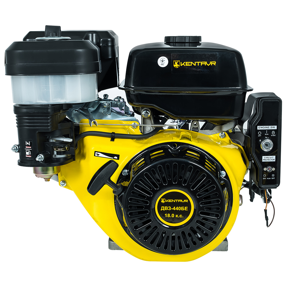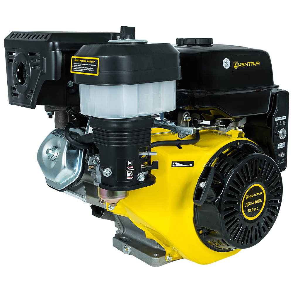 Двигатель внутреннего сгорания кентавр ДВЗ-440БЕ – самый мощный в модельной линейке модульный универсальный бензиновый одноцилиндровый четырехтактный воздушного охлаждения двигатель общего назначения. Двигатель мощностью 18,0 л.с. и рабочим объемом 440 куб. См, может использоваться в составе миниэлектростанций, в сельскохозяйственной технике – мотоблоках, мотокультиваторах, косилках, самоходных шасси, ирригационных и оросительных системах, в строительном оборудовании – виброплитах, ударных трамбовках, бетономешалках, компрессорах, насосах и помпах. Что примечательно, крепление двигателя – универсальное. Фиксация шкива или зубчатого колеса на выходной части вала двигателя для передачи крутящего момента на различные вспомогательные агрегаты, системы и узлы осуществляется при помощи шпоночного соединения.
