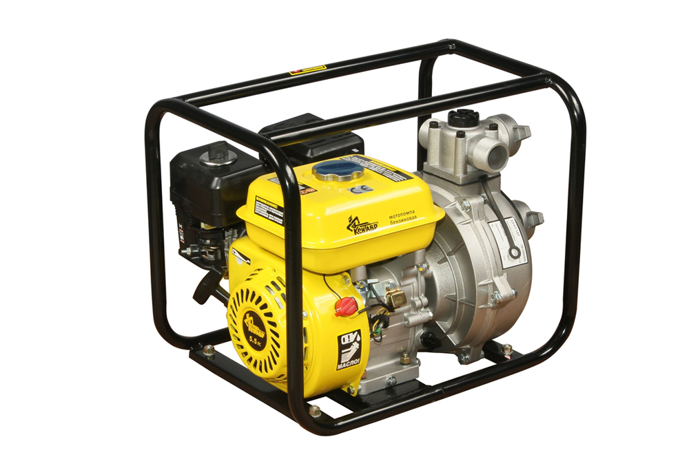 Мотопомпа имеет самые высокие показатели по функциональности. Конструкция данного изделия предусматривает перекачку воды одновременно по трем водопроводным магистралям. Она имеет один всасывающий патрубок ø 50 мм и три нагнетательных – два с ø 40 мм и один ø 50 мм. Однако выдавать максимальную производительность мотопомпа сможет только при использовании одного из двух патрубков ø 40 мм, а остальные нагнетательные патрубки должны быть надежно закрыты заглушками. При таком режиме устройство способно поднимать воду на высоту 65 м, а брать с глубины 7 м. Максимальный перекачиваемый объем воды зависит от высоты подъема и может достигать 30 м³/час. Комплектующие насоса изготовлены из высококачественных материалов – чугунные крыльчатка и диффузор.