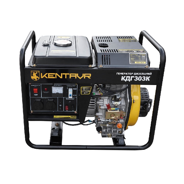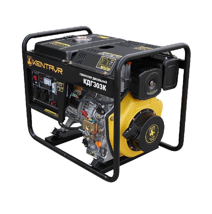 Дизельный генератор Кентавр КДГ-303К — это переносной электрический агрегат, предназначенный для резервного или аварийного питания бытовых потребителей. Вырабатывает однофазный переменный ток напряжением 230 В, частотой 50 Гц. В генераторе применен четырехтактный дизельный двигатель мощностью 6 л.с. Двигатель произведен в заводских условиях с высоким уровнем контроля качества. Инновационная конструкция крышки стартера и крыльчатки охлаждения предотвращает перегрев двигателя. Шум и вибрации при работе дополнительно гасят демпферные опоры, которыми двигатель крепится к жесткой металлической раме. Аварийная система защиты от низкого уровня масла делает невозможным запуск двигателя без масла или с недостаточным его уровнем. Это предотвращает заклинивание подвижных частей и выход из строя всего двигателя.