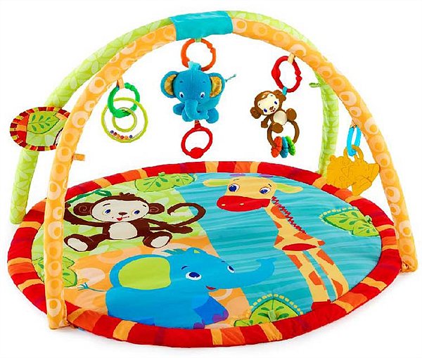 Включает в себя мягкий коврик с изображенными на нем веселыми африканскими зверушками, две дуги для подвешивания игрушек, соединительные кольца и 5 игрушек: