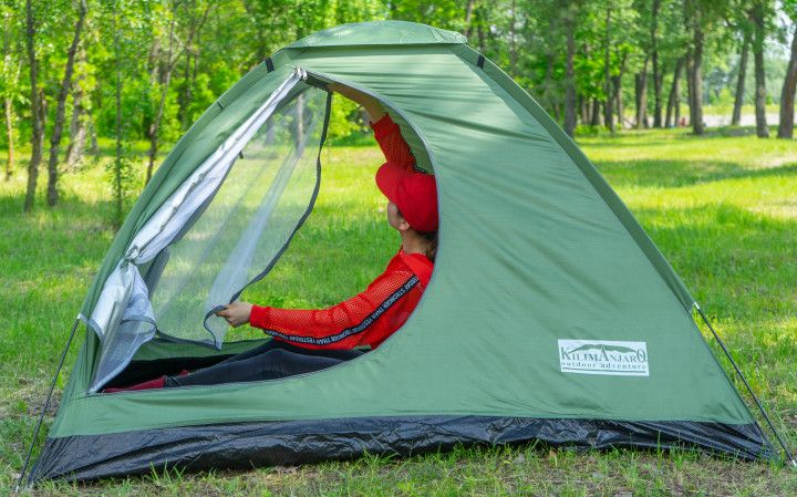 Легкая двухместная палатка Kilimanjaro. Идеальна для походов в летнее время. Однослойная конструкция, вход продублирован москитной сеткой. Каркас палатки образуют секционные дуги выполненные из прочного стекловолокна. Пол выполнен из полиэтилена.