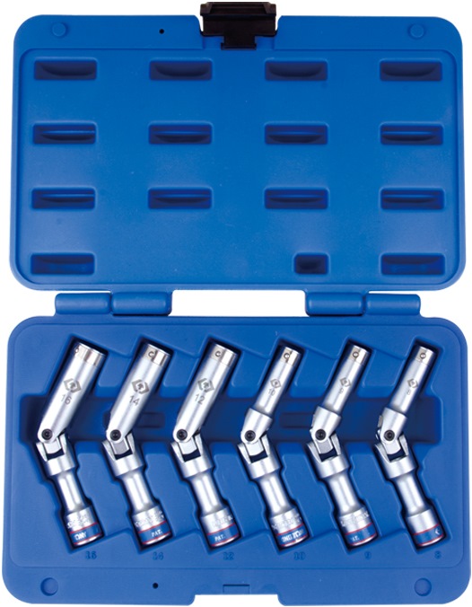 В этом комплекте есть шесть головок различного диаметра с карданом. Кардан позволяет использовать головки под любым удобным вам углом. Каждая головка подходит для использования с квадратным соединением 3/8”, которое считается самым оптимальным для ремонтных работ в легковых автомобилях. Головки полностью изготавливаются из крепкой хромованадиевой стали, обладающей отличным сопротивлением к деформации и ударам. Такие головки могут выдержать крутящий момент до 150 Нм, чего достаточно для затягивания большинства болтов в автомобиле. Качественные головки могут использоваться вместе с профессиональными пневматическими гайковертами без риска поломки.