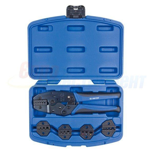 В комплекте с кримпером поставляются 5 обжимок для вилочных и кольцевых наконечников, а также пластиковый кейс для хранения и транспортировки ручного инструмента. Изделие изготовлено из легированной инструментальной стали. Механизм кримпера прост и исключает повреждение в результате проникновения в шарниры мусора, песка и пыли.