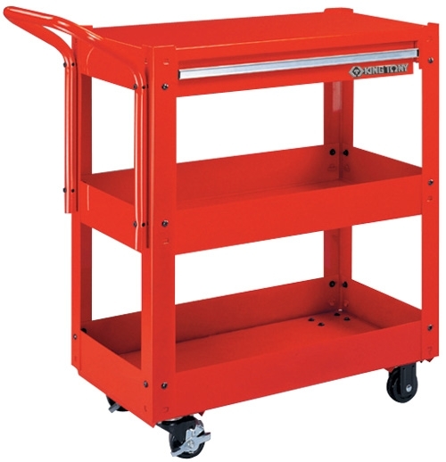 Тумба операторская однополочная оборудованная одним выдвигающимся ящиком для инструмента, способным выдержать нагрузку до 15 кг. Два открытых 3,5-дюймовых лотка под инструмент и детали ограничены грузоподъемностью до 30 килограмм, каждый. Конструкция снабжена колесной базой и защитой от опрокидывания. Для комфортабельной транспортировки, изготовитель King Tony дополнил тумбу большой и удобной ручкой.
