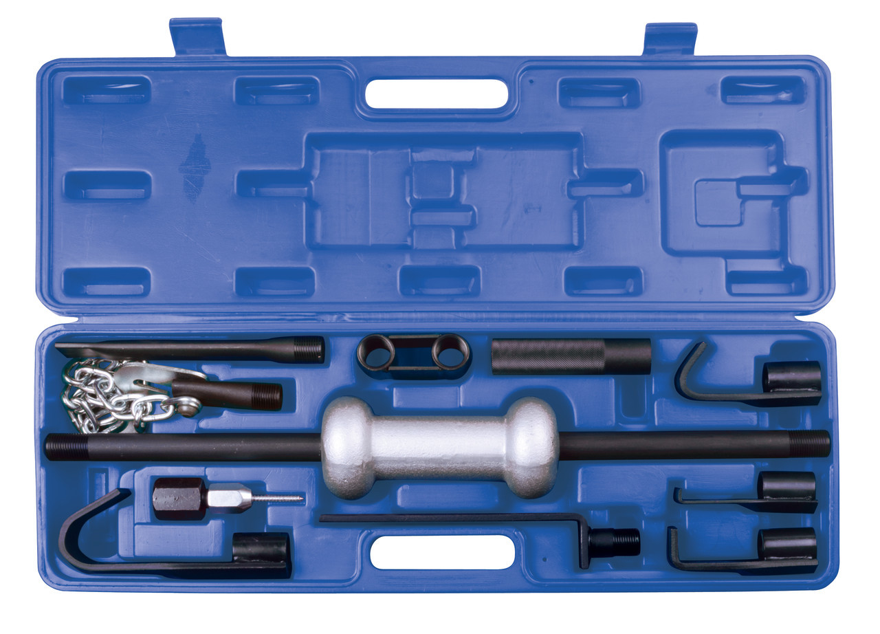 Набор для кузовного ремонта с девятью компонентами обойдутся владельцу дороже, чем классический обратный молоток, однако функционал предлагаемого ручного инструмента на порядок выше. Крюки, идущие в комплекте, справятся с поставленной задачей. Прямые и угловые крюки представлены в узком и широком форм-факторе. Для доступа к скрытым местам в наборе присутствует цепь, которую незапрещенно наращивать. Подобраться к труднодоступным элементам кузова поможет насадка с саморезом или штырем в виде электрода для сварки. Для смещения центра оси обратного молотка в наборе присутствует переходник под резьбовое соединение.
