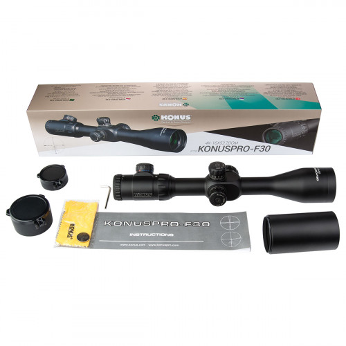 Корпус прицілу KONUSPRO F-30 4-16x52 виготовлено з цільного шматка алюмінію, завдяки чому прилад прослужить не один десяток років. Приціл вирізняється абсолютною водонепроникністю, стійкістю до запітніння і високою ударостійкістю, допускає установку на пружинно-поршневу пневматику. Максимальний калібр, на віддачу якого розрахований цей приціл - .375H&H (6000 Дж).