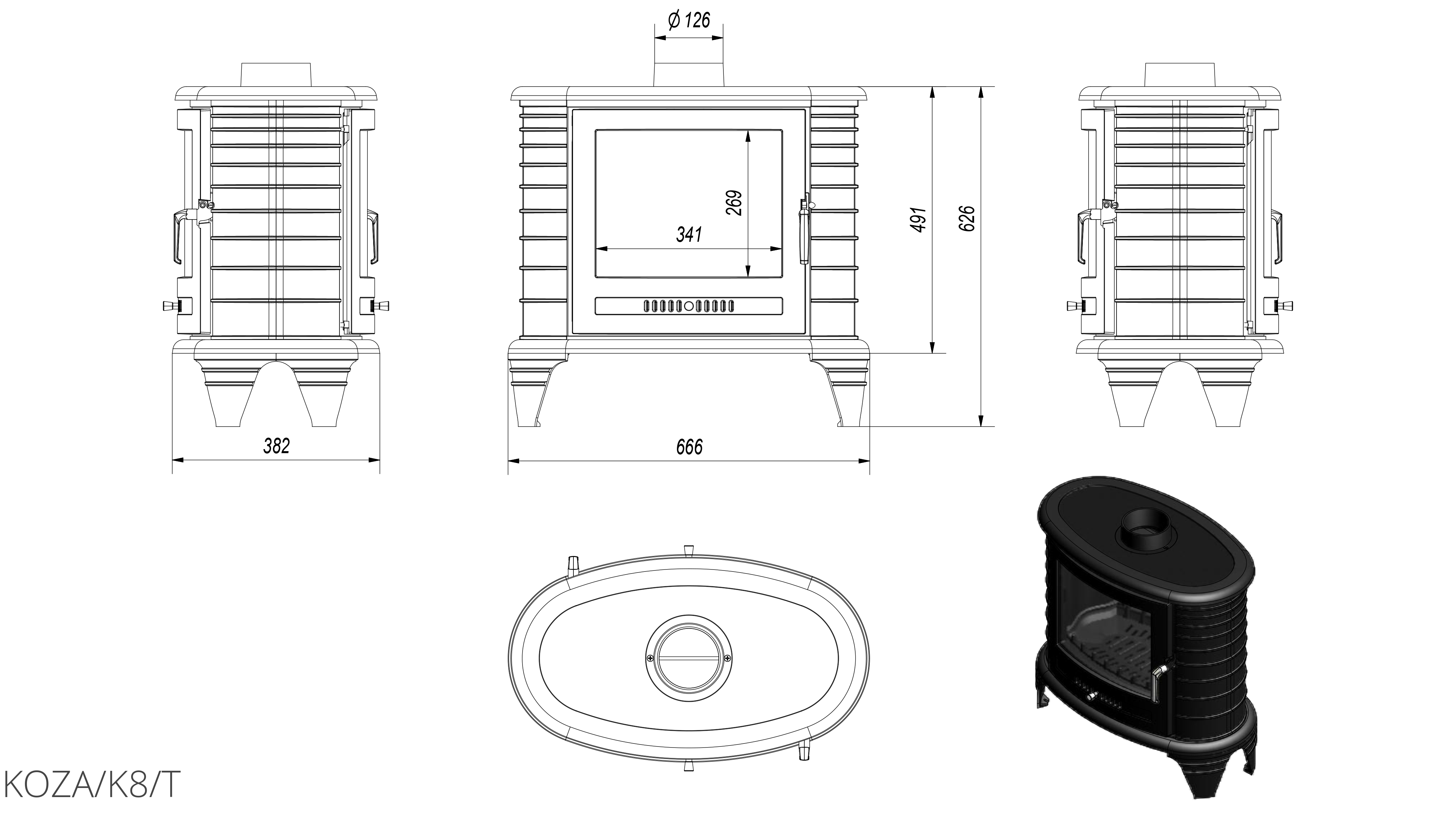 Піч чавунна вільно стоїть Kratki Koza K8 T виконана з сірого чавуну класу 200. Витончений малюнок зовнішньої поверхні, арочна дверцята роблять цю піч-буржуйку справжньою родзинкою дачного інтер'єру. Мінімальна товщина чавунних стінок 8 мм Підключення до димоходу верхнє. Піч оснащена системою чисте скло. Дверцята арочного типу, оснащена великим термостійким склом.
