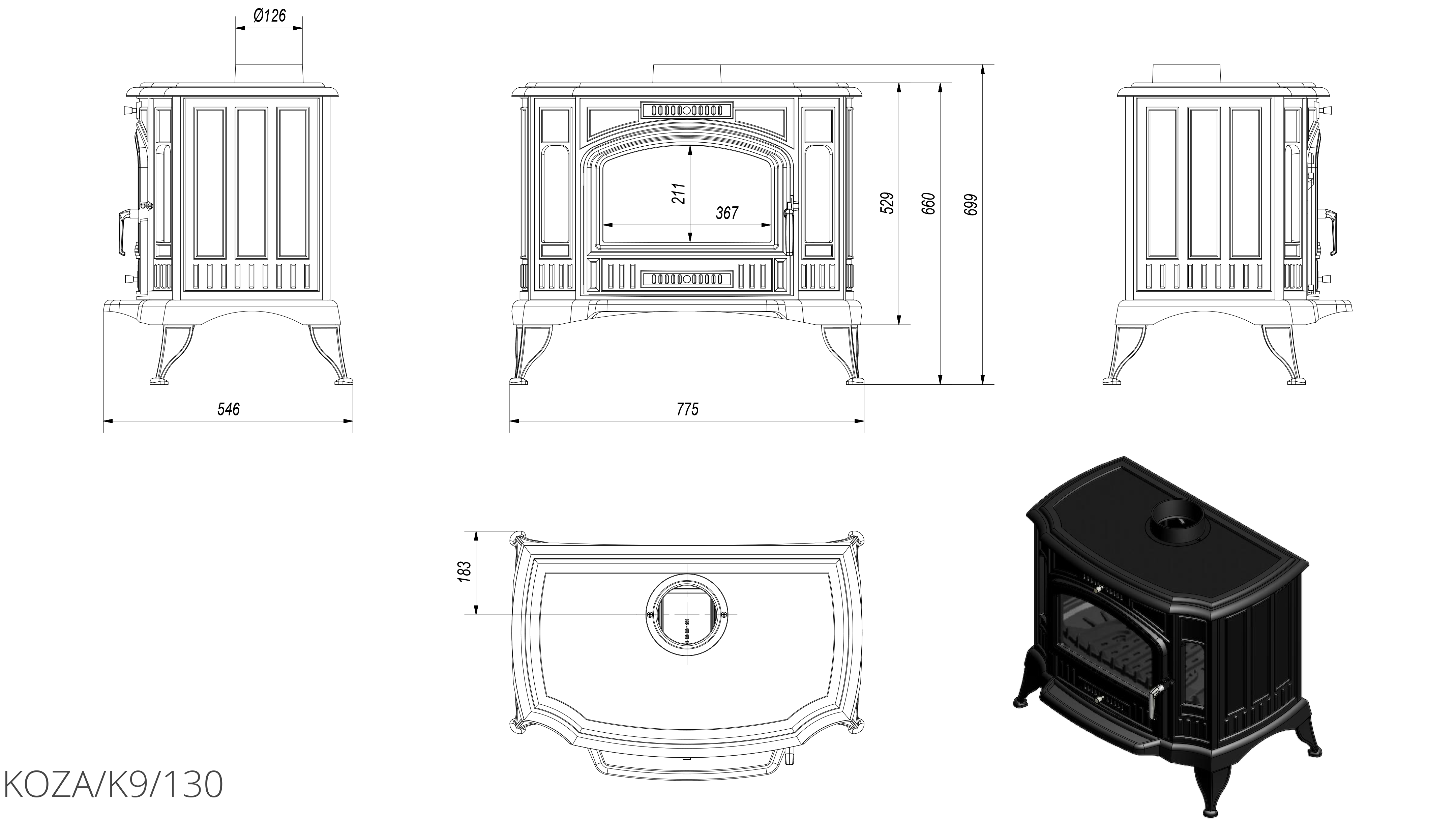 Піч чавунна вільно стоїть Kratki Koza K9 виконана з сірого чавуну класу 200. Витончений малюнок зовнішньої поверхні, арочна дверцята роблять цю піч-буржуйку справжньою родзинкою дачного інтер'єру. Мінімальна товщина чавунних стінок 8 мм Підключення до димоходу верхнє або заднє. Піч оснащена системою чисте скло. Дверцята арочного типу, оснащена великим термостійким склом