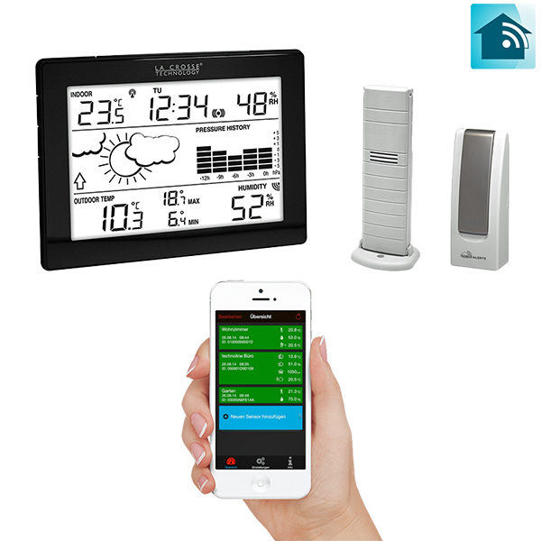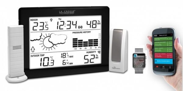 Помимо стандартных для большинства метеостанций функций(прогноз погоды на ближайжие 12 часов, измерение внутренней и внешней температуры и относительной влажности), метеостанция La Crosse MA10006-BLA обладает особенностью, присущей профессиональным метеостанциям. Благодаря встроенной технологии Mobile-Alerts, метеостанция La Crosse MA10006-BLA способна передавать в интернет данные о температуре и относительной влажности воздуха внутри и снаружи помещения. Переданную станцией информацию вы можете оперативно просматривать на экране вашего смартфона с помощью предварительно установленного программного обеспечения.