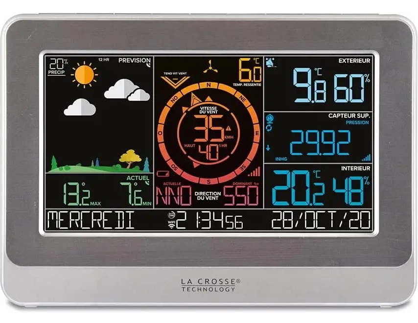 Современная метеостанция La Crosse WS6869 Wi-Fi с широким спектром функций в современном лаконичном дизайне позволит с равным успехом использовать ее как в квартире, так и на приусадебных участках. Контрастный цветной ЖК-дисплей станции показывает такие важные метеоданные как прогноз погоды, температуру, влажность, давление, силу и скорость ветра, уровень осадков, а также многие другие данные. Встроенная функция тревожных оповещений предупредит вас о выходе измеряемых параметров за указанные пределы.