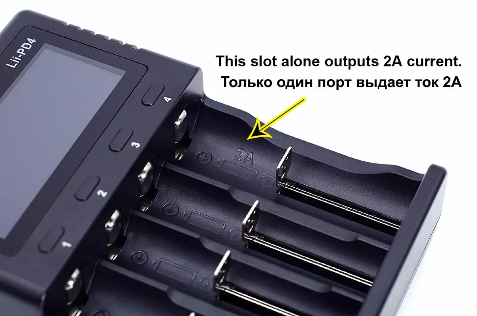 Ток заряда 0,5A / 1A / 2А в зависимости от количества установленных аккумуляторов: