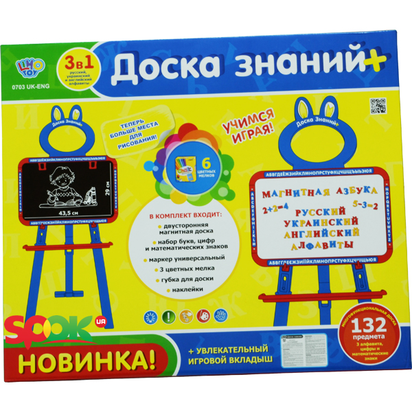 двухсторонний мольберт с магнитной стороной и стороной для рисований. Магнитные буквы: русский, украинский и английский алфавиты.
