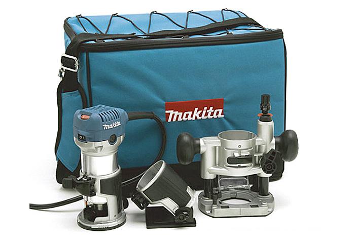В комплект поставки, кроме фрезера Makita RT0700CX2 входят также параллельный упор, 2 зажимных ключа, направляющая, фреза 6 мм, роликовая направляющая, цанга 6 мм, 3 основания и сумка для транспортировки.
