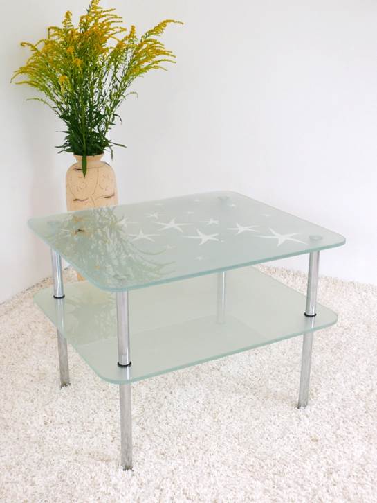 Цвет – матовый с рисунком Размер столешницы 650/550 мм Размер полки 650/550 мм Высота – 470 мм Опори D = 25 мм