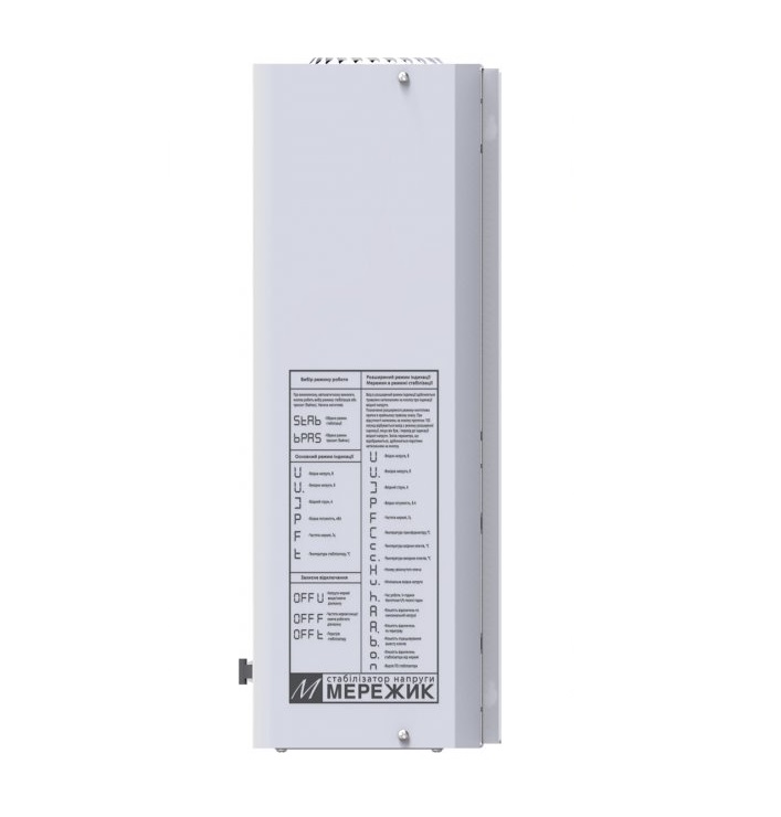 Цифровий індикатор режимів роботи - вхідна і вихідна напруга (В), вхідний струм (А), потужність навантаження (кВА), температура силових ключів (тиристорів) і трансформатора (° C);