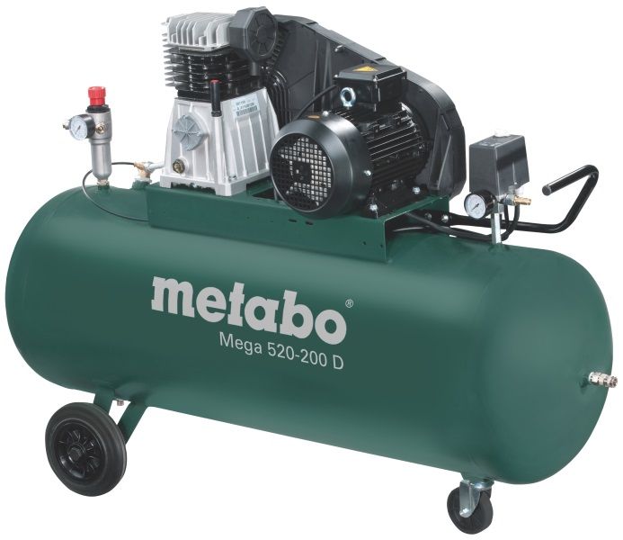 Компрессор Metabo Mega 520-200 D надежный двухпоршневой масляный компрессор с клиноременным приводом и ресивером большого объема. Машина относится к классу профессиональных компрессоров и может использоваться в качестве основного агрегата в пневматических линиях.
