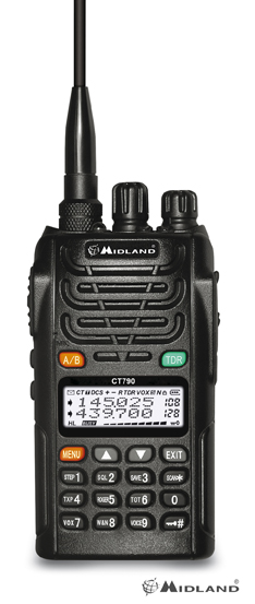 Рация Midland CT-790 - работает в диапазонах 136-174 Мгц (VHF) и 400-470 Мгц ( UHF) . Максимальная мощность передатчика для VHF - 5 вт, для UHF диапазона - 4 Вт.