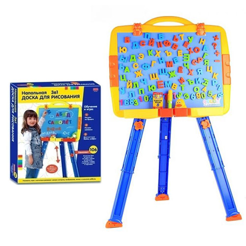 Предназначен для обучения детей в игровой форме чтению и письму. Игрушка представляет собой доску, установленную на треногу. Магнитная доска для рисования маркером, который легко стирается влажной тряпкой или письма магнитными буквами (поставляются в комплекте). Тренога мольберта 0703 регулируется по высоте, а также на ней закреплена полочка для пишущих принадлежностей. Доска знаний предназначена для детей от 3-х лет.