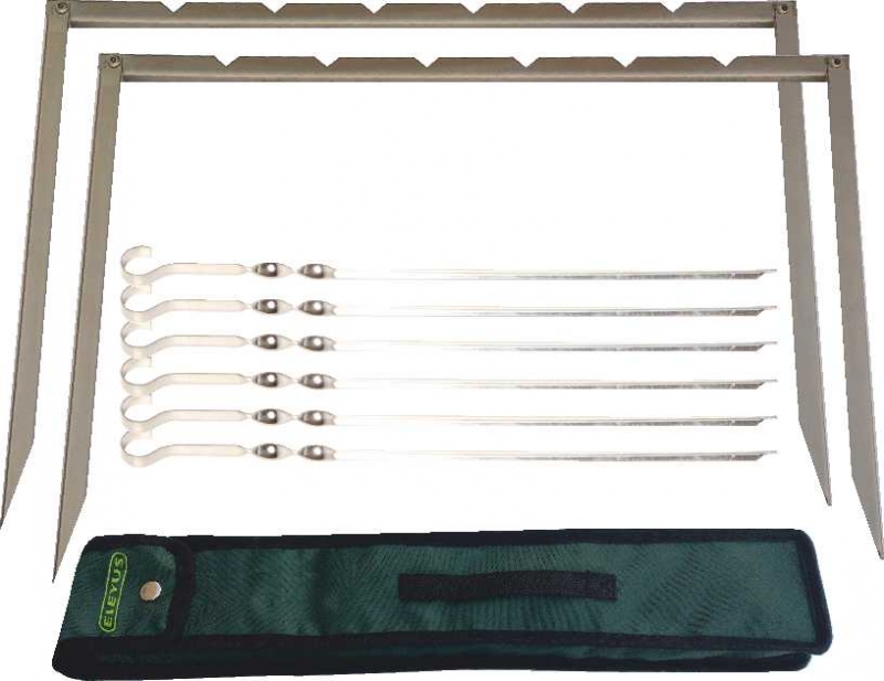 Походный мангал - рамка, изготовленная из нержавеющей стали толщиной 1,5 мм. Расчитан на 6 шампуров, которые идут в комплекте. Мангал очень удобный в использовании. В сложенном виде рамка складывается в удобный чехол с ручкой, в котором находятся все детали мангала и шампуры. Вес мангала 1,1 кг.