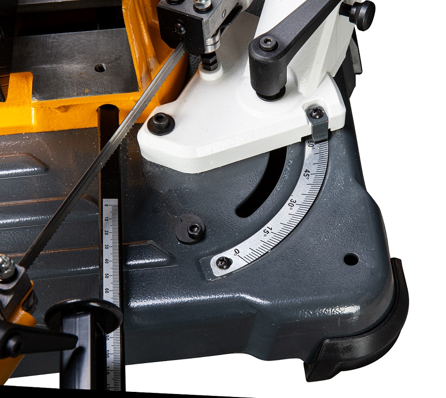 Рама ленточной пилы может поворачиваться от 0 ° до + 60 ° для выполнения угловых пропилов.