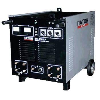 Выпрямители, производства ЗАО «ОЗСО ИЭС им. Патона Е. О.», ВС-650СР DC MIG/MAG MMA с жесткой вольтамперной характеристикой предназначены для сварочных и наплавочных работ в особо тяжелых эксплуатационных условиях (карьеры, шахты, трубопроводов), нечувствителен к суровым климатическим условиям (высокие и низкие температуры, повышенные запылённость или влажность). Выпрямители обеспечивают питание одного поста при полуавтоматической сварке или наплавке на токах до 650 А. При полуавтоматической сварке регулировка сварочного напряжения осуществляется ступенчато (27 ступеней). Сварочные выпрямители могут применятся для воздушнодуговой строжки угольным электродом. Большой запас мощности позволяет вести сварку при длине коммуникаций между источником и блоком подачи более 50 м., что делает его незаменимым при выполнении монтажных работ , например, с блоком подачи «Патон БП 607». В систему питания сварочной дуги помимо основного встроен параметрический дроссель, который позволяюет существенно повысить качество получаемых сварных соединений, благодаря обеспечиваемой дросселем стабилизации процесса сварки и регулировки тока короткого замыкания (к.з.), происходящего при переходе капли расплавленного металла с электрода в сварочную ванну. Кроме основной силовой обмотки, как правило, используют вспомогательную обмотку, которая служит для регулирования величины индуктивности дросселя и, тем самым, пикового значения тока к.з. в указанном переходном процессе. Вспомогательная обмотка позволяет сократить время к.з. и уменьшить размер капли расплавленного металла, что улучшает формирование сварного шва и обеспечивает более гладкую его поверхность. Дополнительный эффект достигается при подключении начала вспомогательной обмотки через диод к электроду, а её конца к свариваемому изделию. При к.з. электрода с изделием через каплю расплавленного металла происходит нарастание тока в силовой обмотке и нарастание тока во вспомогательной обмотке, которые суммируются, в результате чего ток к.з. резко возрастает, одновременно сокращая время и увеличивая частоту повторения процесса перехода капли с электрода на изделие. Перенос металла становится мелкокапельным, сокращаются потери электродного металла на угар и разбрызгивание, выгорание легирующих элементов, снижается окисление металла. Использование параметрического дросселя не только улучшает формирование и качество сварного шва, особенно при сварке тонкого металла, но и облегчает наложение вертикальных и потолочных швов. Возможна многопостовая ручная дуговая сварка: для ВС-650СР: 2 поста - 400А, 3 поста - 315А, 4 поста - 250 А. При этом сварка идёт на максимальном напряжении холостого хода с раздельной регулировкой тока сварки на каждом посту при помощи балластных реостатов РБ 302. Выпрямители Патон ВС-650 имеют на лицевой панели четыре отдельных выхода для ручной дуговой сварки или многофункциональной сварки при помощи чопперов.
