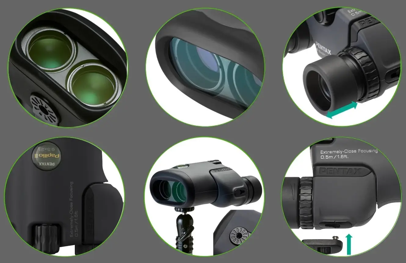 Компактний бінокль Pentax UP 8.5x21 Papilio II (62002) відповідає сучасним вимогам та стандартам: повне багатошарове просвітлення лінз, призми з високоякісного оптичного скла BaK4. Оновлене покриття лінз з покращеним світлопропусканням створює кришталево чітке зображення. Бінокль Pentax UP 8.5x21 Papilio II (62002) унікальна модель. Завдяки механізму автоматичної компенсації зміщення поля зображення правого та лівого монокулярів при фокусуванні, забезпечується унікально коротка дистанція спостереження в бінокль Papilio – лише 50 см! Бінокль серії Papilio призначений не тільки для макроспостереження з відстані 50 см, користувач також можете детально спостерігати за будинками архітектури, зоряним небом чи спортивними змаганнями. Корпус виробу має гумове покриття яке сприяє додатковому захисту від механічних пошкоджень. Модель бінокля Pentax UP 8.5x21 Papilio II (62002) призначена для використання під час подорожей, спостереження за дикою природою, тощо.