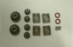 В комплект входит: 2 конических шестерни, 4 сателлитных шестерни, 4 проставки сателлитов, 2 резиновых кольца, 2 металлических оси.