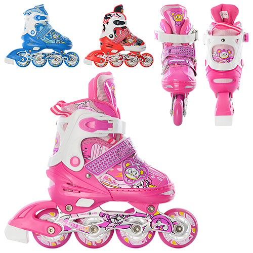 Ролики раздвижные A 3066 S (31-34), 3 цвета Укомплектованы специальными частями, позволяющими устанавливать задние колеса парами (получается 3-х точечная опора) Характеристика: Роликовые коньки с возможностью регулировки размеров Возможность регулировки в 4-х размерах Ботинок мягкий; Надежная рама из пластика; Удобные застежки-бакля +пяточный ремень+шнуровка Диаметр колёс 64 мм PVC Колеса цветные Подшипники 608Z carbon эксклюзивный дизайн ботинка