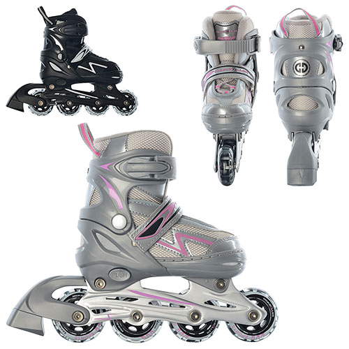 Детские раздвижные ролики полупрофессиональные Размер 30-33 Характеристика: Роликовые коньки с возможностью регулировки размеров Возможность регулировки в 4-х размерах (стелька 15,5 см +2,5 см на увеличение размера, минимальный обхват голени 16см) Ботинок мягкий; Надежная рама из алюминия; Удобные застежки-бакля +пяточный ремень+шнуровка Диаметр колёс 64 мм PVC Колеса прозрачные Подшипники 608ZB