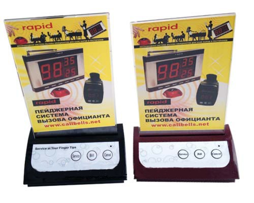 Кнопка вызова официанта с рекламой и 3 функциональными кнопками вызова (Вызов, Счет, Отмена вызова). Выполнена в форме подставки для рекламы