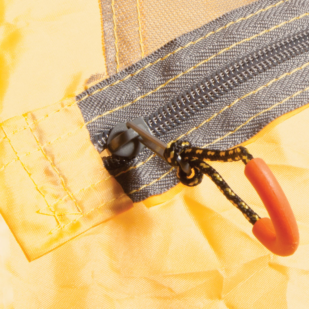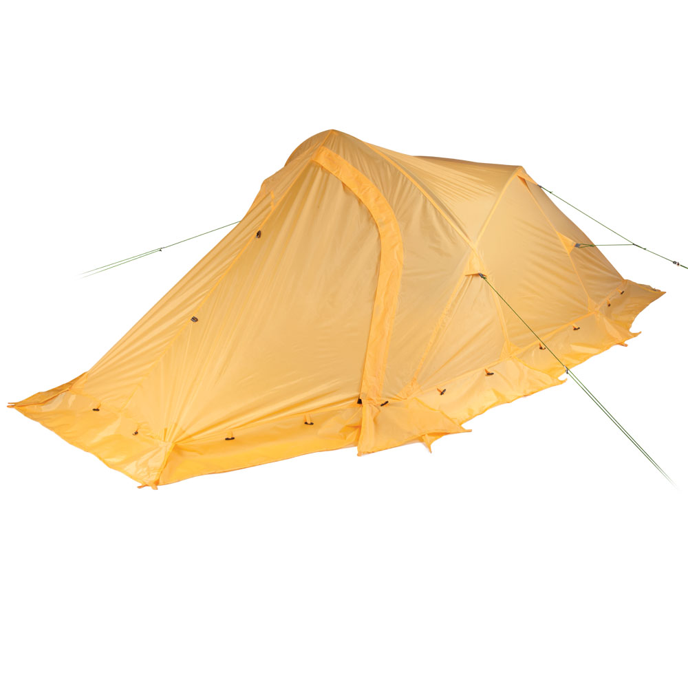 Обычная двухместная палатка за счет интересной формы с просторным тамбуром преобразилась в расширенный вариант обители, позволяя разместить все снаряжение без загромождения основного пространства палатки. Основой устойчивого и легкого каркаса служат 3 дуги, специально промаркированные своим цветом для простоты установки.