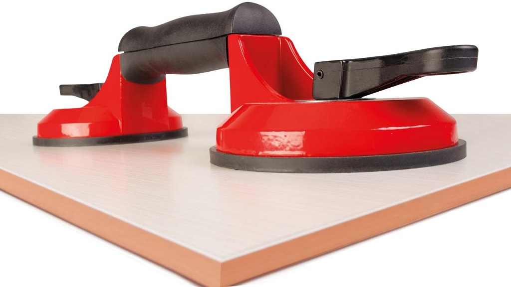 Двойная присоска RUBI - прочная конструкция, изготовленная из прочного аллюминия. Эргономичная рукоятка разработана с целью обеспечить максимальное удобство при перещении керамической плитки большого формата. Максимальная нагрузка на двойную присоску RUBI составляет 80кг. Идеальна для премещения керамической плитки очень большого формата, стеклянных панелей или других крупных элементов.