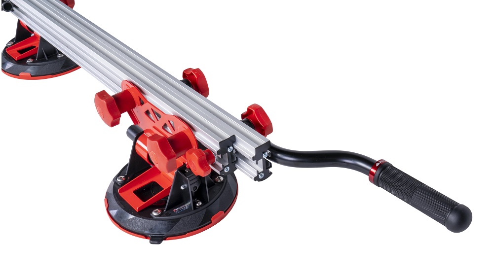 Система состоит из двух телескопических, усиленных профилей из экструдированного алюминия и двух поперечных штанг, обеспечивающих прочность и стабильность всей системы даже при манипуляциях с самыми тяжёлыми плитами.