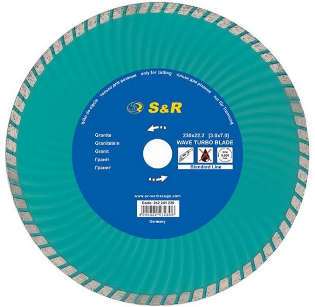 Диск отрезной S&R Turbo по граниту Standart подходит для угловых шлифовальных машин и бороздоделов.
