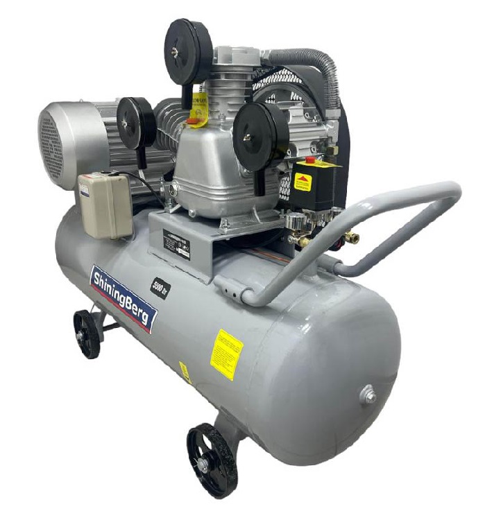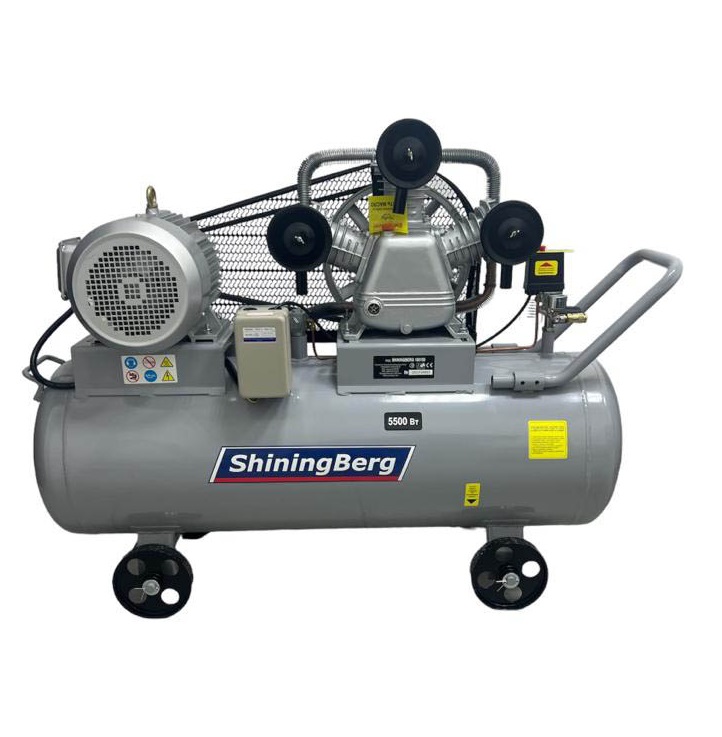 Поршневой воздушный компрессор ShiningBerg предназначен для снабжения сжатым воздухом пневматического оборудования на производстве и в мастерских. Компрессор обладает мощным двигателем 5.5 кВт напряжением 380 В. Производительность компрессора составляет 904 л/мин при 8 атмосферах рабочего давления. С такой производительностью к компрессору можно смело подключать несколько пневматических инструментов одновременно. Компрессор имеет современную W-образную головку с тремя стальными цилиндрами. Благодаря такому расположению цилиндров значительно сэкономлена площадь. занимаемая помпой компрессора. На каждом цилиндре имеются всасывающие фильтры.
